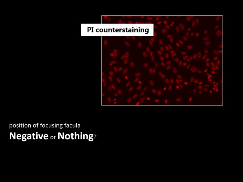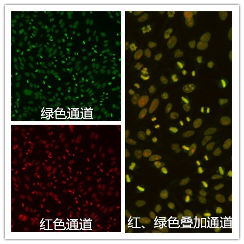 EUROPattern拍出的圖片,共有三種。綠色通道,即與熒光顯微鏡拍出的圖片相同。紅色通道,細(xì)胞核經(jīng)過(guò)碘化丙啶紅色復(fù)染,通過(guò)紅色通道獲取信息,不僅可以幫助尋找和識(shí)別細(xì)胞核和分裂期細(xì)胞,還可以避免可能出現(xiàn)的假陰性結(jié)果。紅綠疊加通道,可以清晰的觀(guān)察區(qū)分細(xì)胞核與細(xì)胞胞漿信息。