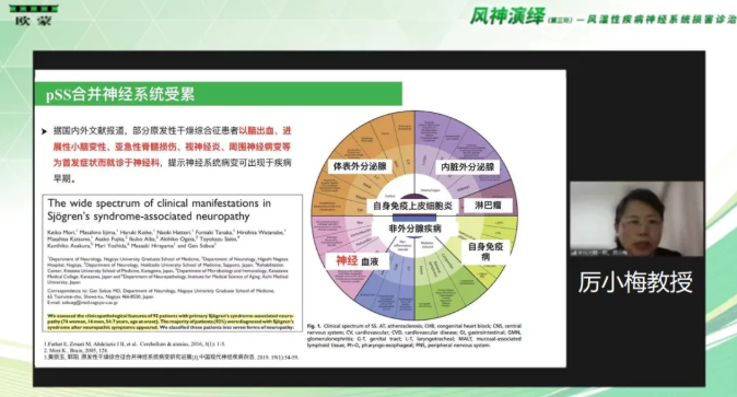 接下來,厲小梅教授又針對干燥綜合征引發的神經系統受累進行了詳細的講解。厲小梅教授指出干燥綜合征(SS)除了口腔和眼部受累外,還可影響人體多個系統。其中神經受累是SS常見的腺外表現之一:周圍神經和中樞神經系統均可發生病變,但周圍神經系統病變更為多見,且臨床表現多樣;而中樞神經系統病變發病率相對較低,臨床表現主要以頭痛和認知功能障礙為主。此外,厲小梅教授指出為了減少漏診和誤診,疾病的臨床診斷不止要依賴臨床表現,還需結合實驗室檢測結果進行確認。她強調了SS相關的血清學檢測指標ANA、抗SSA抗體、抗SSB抗體等的臨床意義,并且提到呈抗SSA抗體陽性的患者更容易出現無先兆偏頭痛。