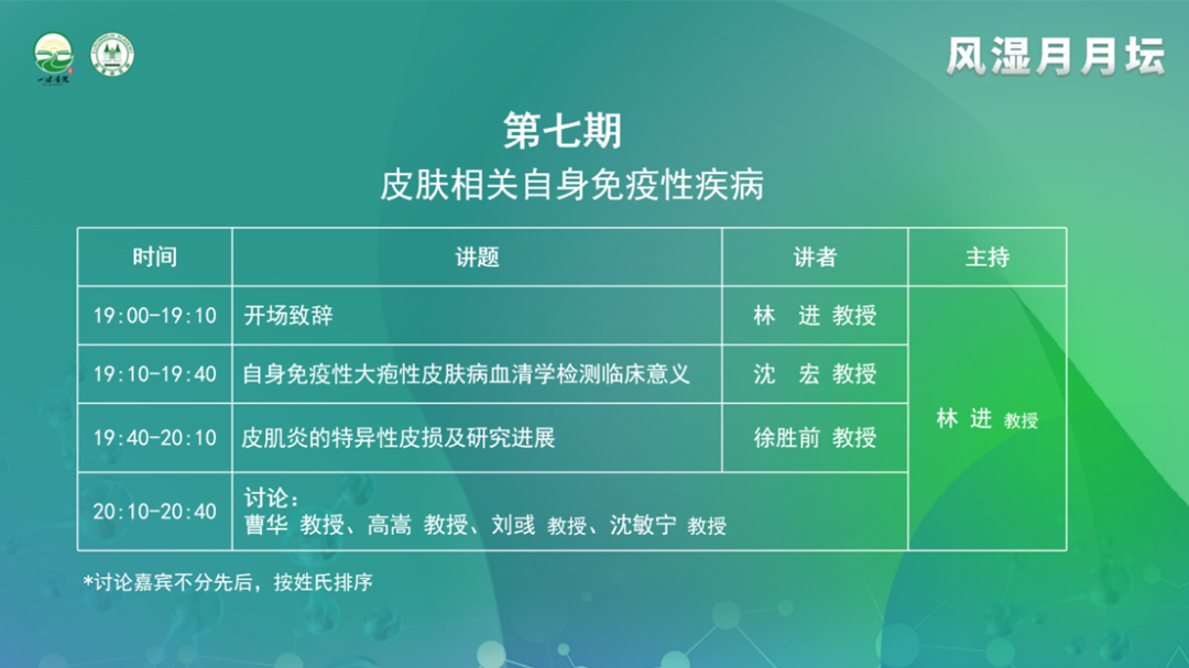 2023年2月10日,由一味書院主辦的《風濕月月壇(第7期)——皮膚相關自身免疫性疾病》于線上成功舉行。本次論壇由浙江大學醫學院附屬第一醫院林進教授擔任大會主席,浙江中醫藥大學附屬杭州市第三醫院沈宏教授、安徽醫科大學第一附屬醫院徐勝前教授作為講課嘉賓,上海交通大學醫學院附屬瑞金醫院曹華教授、浙江大學醫學院附屬第二醫院高嵩教授、上海交通大學附屬同仁醫院劉彧教授、南京醫科大學附屬南京醫院沈敏寧教授作為本次大會的討論嘉賓。