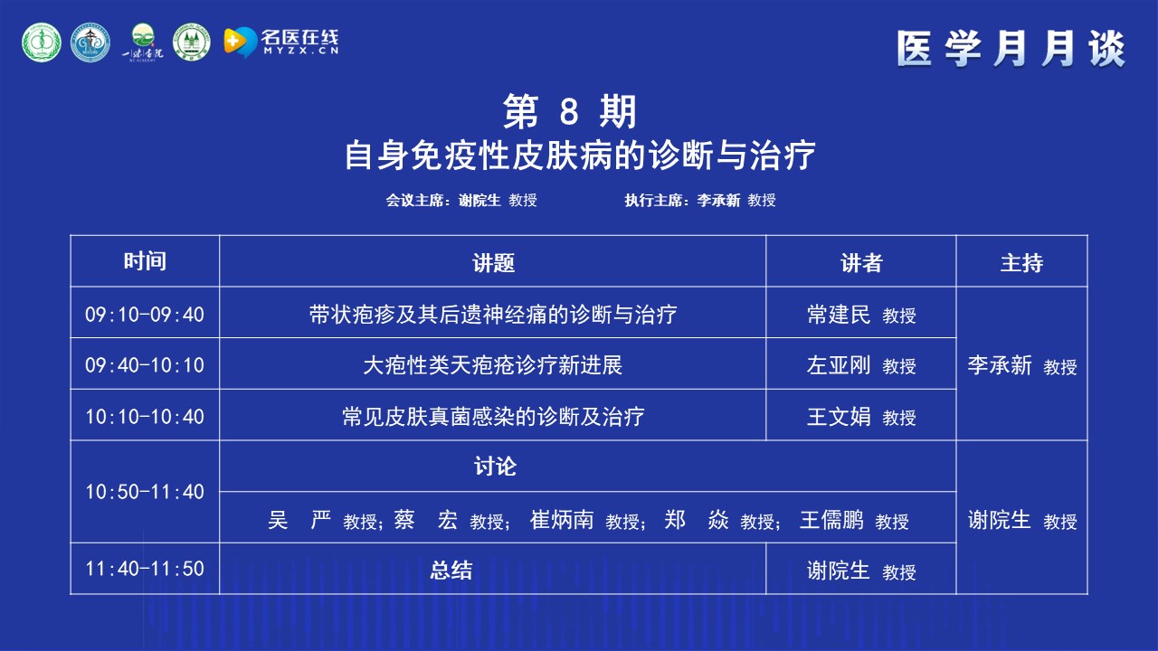 謝教授簡(jiǎn)單介紹了“醫(yī)學(xué)月月談”的前身“腎病月月壇”的歷史,“腎病月月壇”是在疫情防控期間開(kāi)展的線上學(xué)術(shù)交流活動(dòng),以腎臟病或系統(tǒng)性疾病腎損害的診治為主,每期一個(gè)主題,形式和內(nèi)容都很受歡迎。為了讓更多的人受益,升級(jí)為“醫(yī)學(xué)月月談”。“醫(yī)學(xué)月月談”是一個(gè)以臨床需求為導(dǎo)向、以解決臨床問(wèn)題為目的、線下和線上相結(jié)合的醫(yī)學(xué)交流活動(dòng)。本期醫(yī)學(xué)月月談的主題是自身免疫性皮膚病的診斷與治療,之所以選擇這個(gè)專(zhuān)題,主要基于兩點(diǎn)考慮:其一,"醫(yī)學(xué)月月談"始終秉持跨學(xué)科理念,涵蓋腎科、皮膚科、風(fēng)濕免疫科等多領(lǐng)域;其二,腎病患者普遍存在免疫力低下問(wèn)題,尤其在應(yīng)用激素和免疫抑制劑后,易并發(fā)帶狀皰疹、皮膚真菌感染、大皰性皮膚病等,這些并發(fā)癥嚴(yán)重影響患者生活質(zhì)量和預(yù)后。因此,本期特別邀請(qǐng)到在自身免疫性皮膚病研究領(lǐng)域非常著名的李承新教授作為本期的執(zhí)行主席,相信本期月月談在李教授的引導(dǎo)下,在各位專(zhuān)家們的大力支持下,取得圓滿成功。
