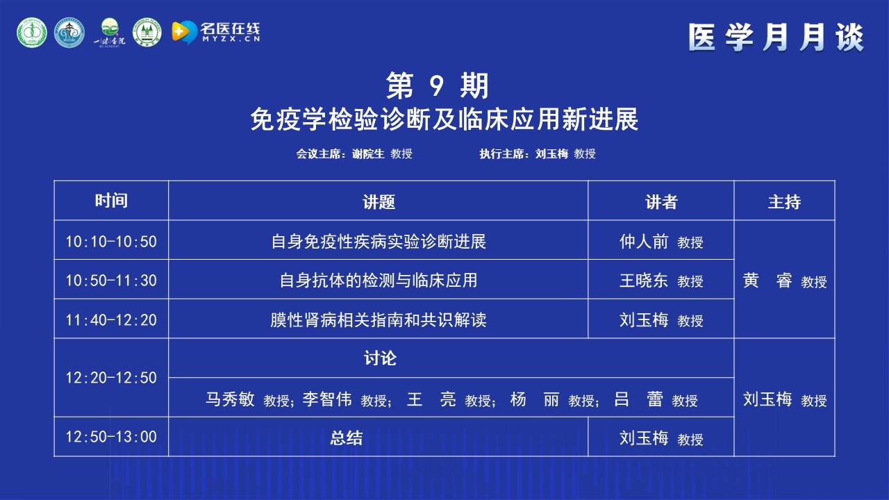 謝教授簡單介紹了“醫(yī)學月月談”的前身“腎病月月壇”的歷史,“腎病月月壇”是在疫情防控期間開展的線上學術(shù)交流活動,以腎臟病或系統(tǒng)性疾病腎損害的診治為主,每期一個主題,形式和內(nèi)容都很受歡迎。為了讓更多的人受益,升級為“醫(yī)學月月談”。“醫(yī)學月月談”秉承“腎病月月壇”的優(yōu)良傳統(tǒng),聚焦醫(yī)學工作的熱點和難點,以臨床需求為導向,以解決臨床問題為目的,每月主辦1-2次線下和線上相結(jié)合的醫(yī)學交流活動,線下在全國的城市輪流舉辦,已相繼在北京、沈陽、上海、南京、武漢、福州等地成功舉辦8期醫(yī)學月月談。本期醫(yī)學月月談的主題是免疫學檢驗診斷及臨床應(yīng)用新進展,非常榮幸的邀請到新疆維吾爾自治區(qū)中醫(yī)醫(yī)院檢驗科主任劉玉梅教授作為本期的執(zhí)行主席,相信本期月月談將在劉教授的引導下,在各位專家們的大力支持下,取得圓滿成功。
